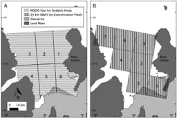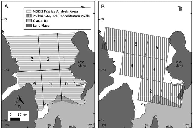 Description: Figure A shows the division of McMurdo Sound into six zones; fast ice areas were generated manually from clear-sky images by drawing polygons in GIS software, and pack ice was excluded from analysis. The fast ice in MODIS scenes was sometimes obscured by clouds, so for days with missing imagery we interpolated linearly between valid data. Areas of persistent multiyear ice or glaciers that were not considered in the analysis (white in the figure). Figure B shows the total of seven pixels in the 25 km polar stereographic projection that encompassed McMurdo Sound; for each pixel, daily or bi-daily fractional sea ice cover was extracted. SSM/I passive microwave sea ice observations do not distinguish between fast ice and pack ice. There are small amounts of land and ice shelf contamination in pixels 1, 2, 5 and 7.